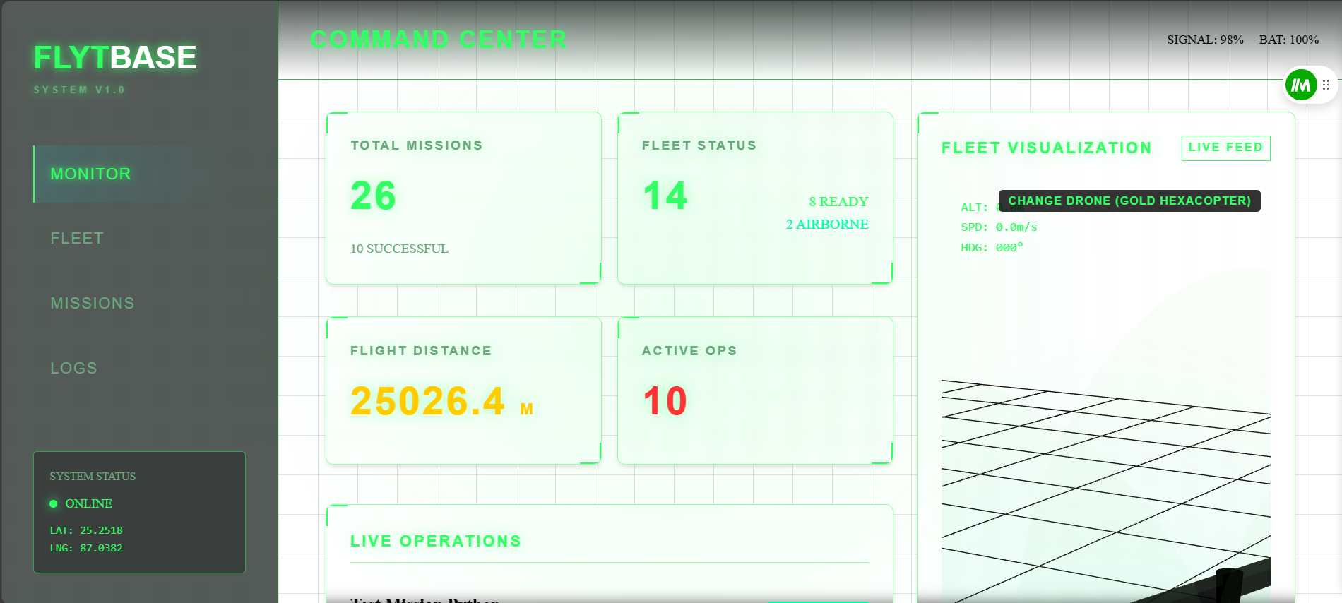 - Live drone status and fleet visualization on dashboard components.