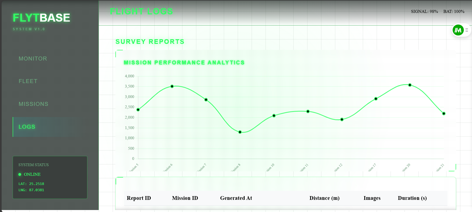 DroneX is a full-stack application designed as a scalable ground control station (GCS) for planning and managing autonomous drone survey missions. The system enables users to define survey areas and flight paths, visualize mission progress, monitor drone fleet status, and generate mission reports through an intuitive dashboard. Built with modern frontend and backend technologies, it emphasizes real-time visualization, responsive UI, and extensible architecture suitable for operational drone control workflows.