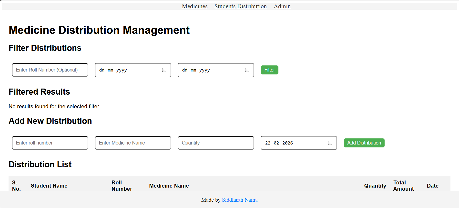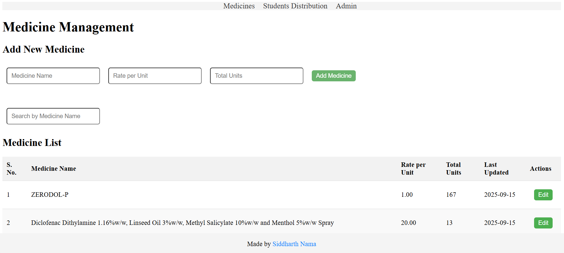 Developed a centralized medical inventory and distribution management system for the Medical Department at IIIT Bhagalpur. The platform streamlines medicine stock management, tracks student distributions, and generates bills automatically. Deployed on the college server for real-world administrative use with accurate record-keeping and stock updates.