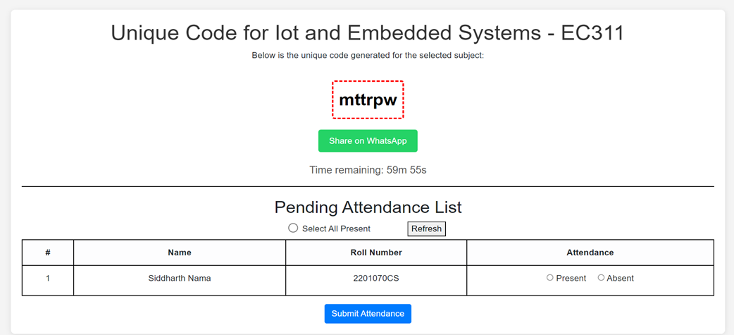 - 6-Digit Unique Code Generation: Teachers can generate shareable codes (via WhatsApp or other platforms) for attendance.