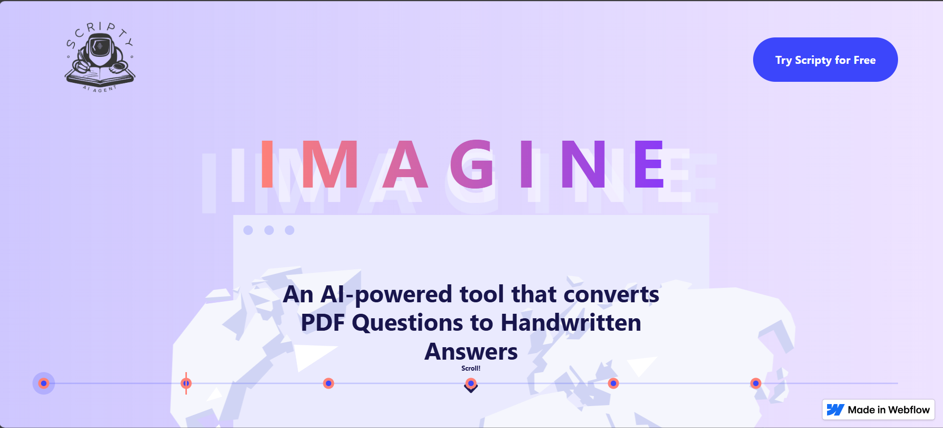 Scripty is an AI-powered smart assignment generator that converts handwritten or text-based PDFs into clean, editable, and submission-ready handwritten-style documents. It leverages OCR to extract text from uploaded PDFs, uses AI models to rewrite or generate well-structured answers, and renders the final output in natural handwritten fonts with ruled-paper styling, allowing users to make last-minute edits before exporting polished PDFs.